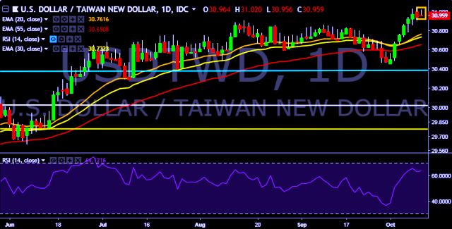 We prefer to take long position on USD/TWD only above 31.05, stop loss at 30.70 and target of 31.42.
