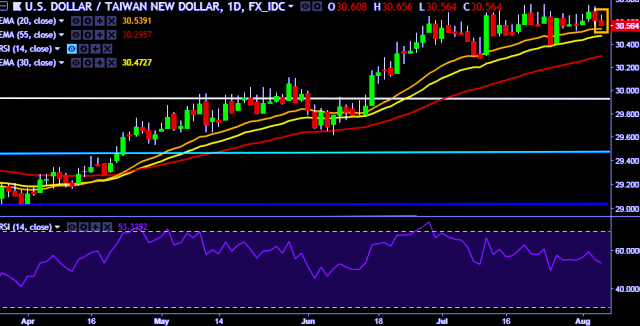 We prefer to take short position on USD/TWD only below 30.50, stop loss at 30.70 and target of 30.28.