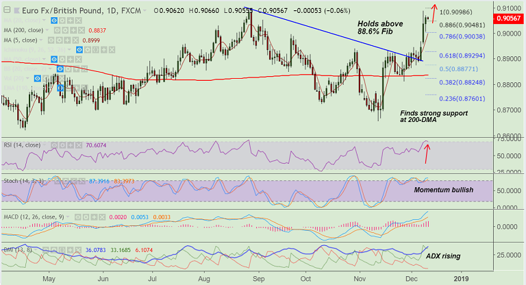 - EUR/GBP bounced off lows on Tuesday's trade to close higher, maintains bullish momentum.