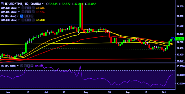 We prefer to take long position on USD/THB only above 32.90, stop loss 32.68 and target of 33.20 mark.