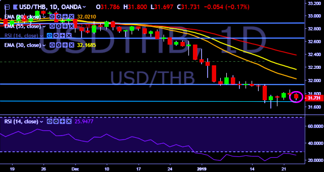 We prefer to take short position on USD/THB around 31.75, stop loss at 31.90 and target of 31.46.