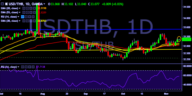 We prefer to take long position on USD/THB only above 33.15, stop loss 33.02 and target of 33.52.