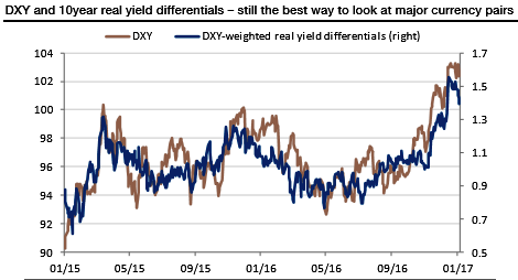 Real bond yields continue to drive currency trends after the FOMC hiked rates in last December month, the dollar’s having a bit of a wobble. There are echoes of the dollar’s correction in the first half of 2016, partly because the peak in real US yields is almost identical to what we saw in January 2016, but we still expect to see nominal US yields reach 3%, real yields reach 1% and the DXY index rally by a further 5% between now and the end of President Trump’s first hundred days in office.