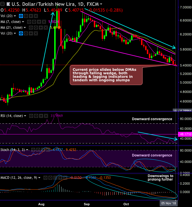 Technically, USDTRY current price on daily terms, has been sliding below DMAs through falling wedge, while both leading and lagging indicators are in tandem with ongoing slumps. While current intermediate trend slides below 21EMAs, both leading and lagging indicators on this timeframe are also in sync with the downtrend (refer weekly plotting).
