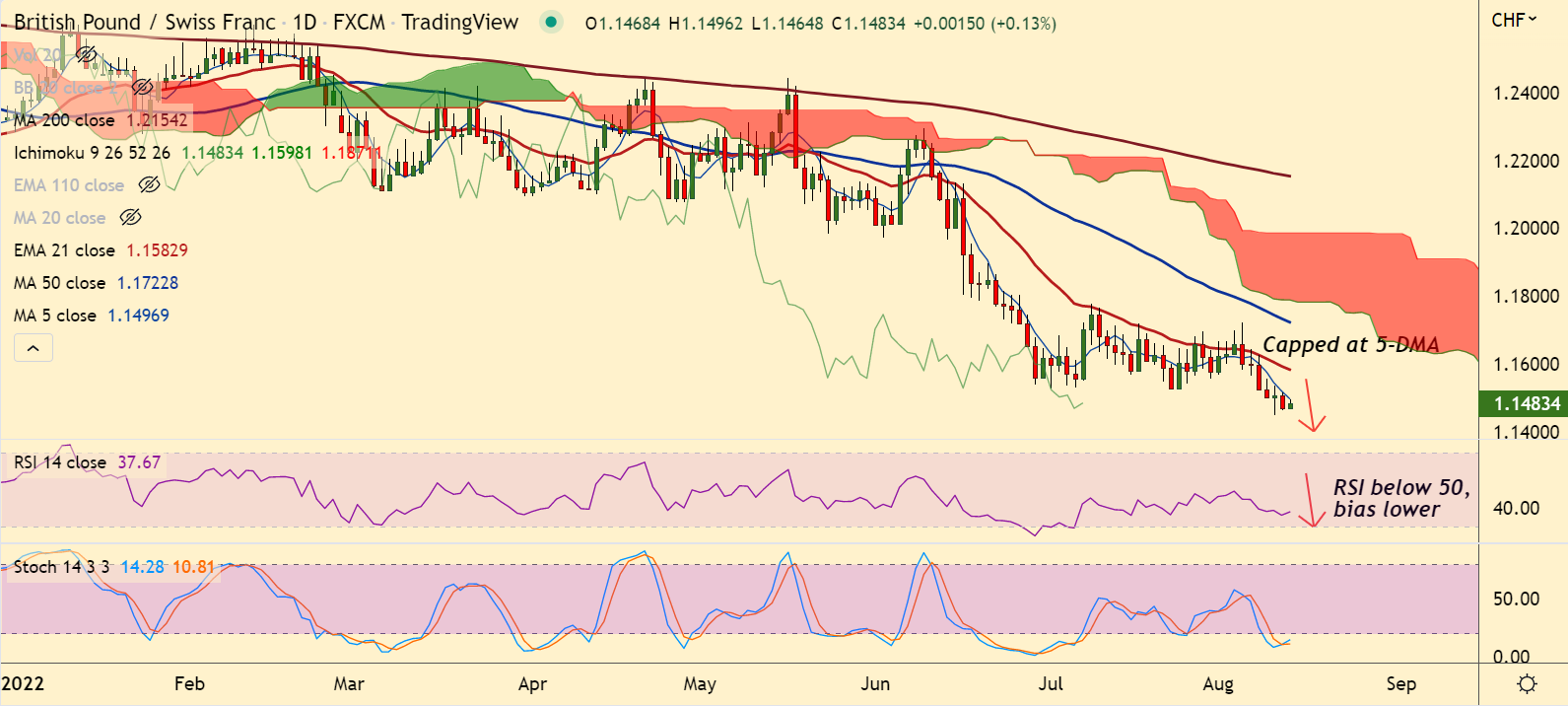 Summary: GBP/CHF trades with a bearish bias. Upside remains capped at 5-DMA. Major and minor trend are strongly bearish. Scope for further downside.
