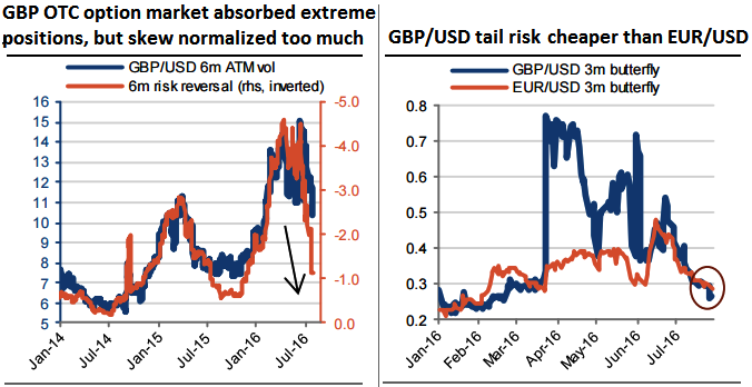 Cable skew normalised too much Five weeks after the Brexit vote, the GBP volatility market normalised sharply. The liquidity recovered and the extreme positioning was ultimately absorbed. The price action is not taking the direction of an imminent new trend. As a result, the option market aggressively unwound smile positions.