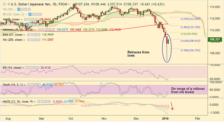 - USD/JPY is hovering around 61.8% Fib. The pair finds imeediate resistance at 5-DMA at 108.94.