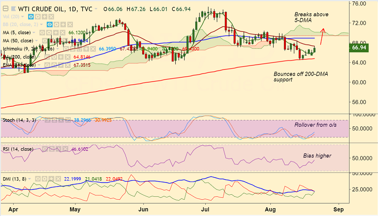 - Price action is extending gains above 5-DMA at 68.12. Breakout at 110-EMA to see further upside.