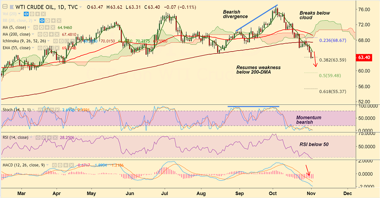 - The pair is extending break below 200-DMA and now hovers around major support at 38.2% Fib at 63.59.