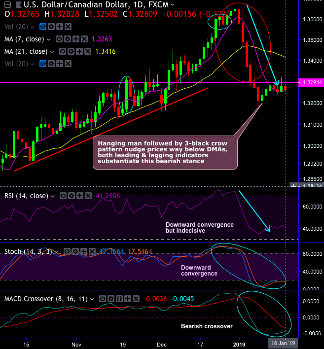 Ever since then bears managed to nudge prices below DMAs &EMAs from last three weeks. But for this week, the pair has halted bearish streaks and attempts to bounce back on the formation of hammer candle at 1.3263 levels. But bullish momentum seems unlikely.