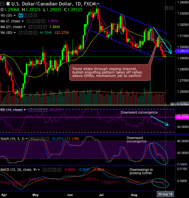 - Technically, near term resistance is around 1.2965 levels and one can expect more upswings only upon any convincing break-out above these levels. Minor trend slides through sloping channel. For now, the bulls are activated at strong channel support of 1.2887 levels. But the momentum is yet to confirm, while trend indicators signal more slumps upon bearish DMA and MACD crossovers & intensified bearish momentum (RSI & stochastic curves’ downward convergence, refer daily chart). While the major trend spikes through rising channel, and shooting star pops-up exactly at channel resistance to plummet prices below 7EMA, further weakness signaled by momentum oscillators, the momentum oscillators indicate Over Bought pressures. On the lower side, near term support is at around 1.2887 levels and any convincing break below will drag the pair down till 1.2741.