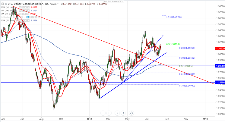 USD/CAD hits 3- week high and shown a minor decline from that level. The pair hits high of 1.31700 after huge sell off in Turkish lira.The huge selling in Turkish lira after Donald Trump imposed double tariffs for metal to Turkey. This has made investors to dump equities and started to switch to safe haven assets like Yen,dollar etc.