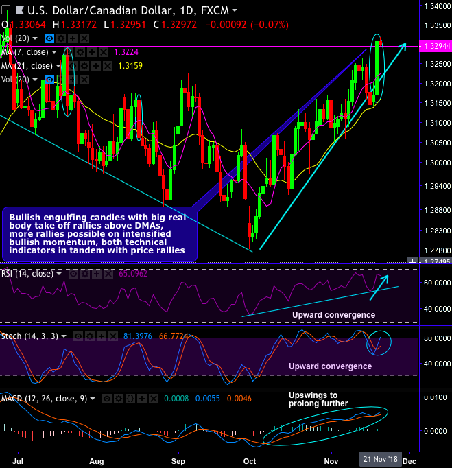 - Technically, bullish engulfing candles with big real body take off USDCAD rallies above DMAs. For now, the bulls are intensified as the momentum is also confirmed by both RSI & stochastic curves show upward convergence and MACD indicates upswings to prolong further (refer daily chart).