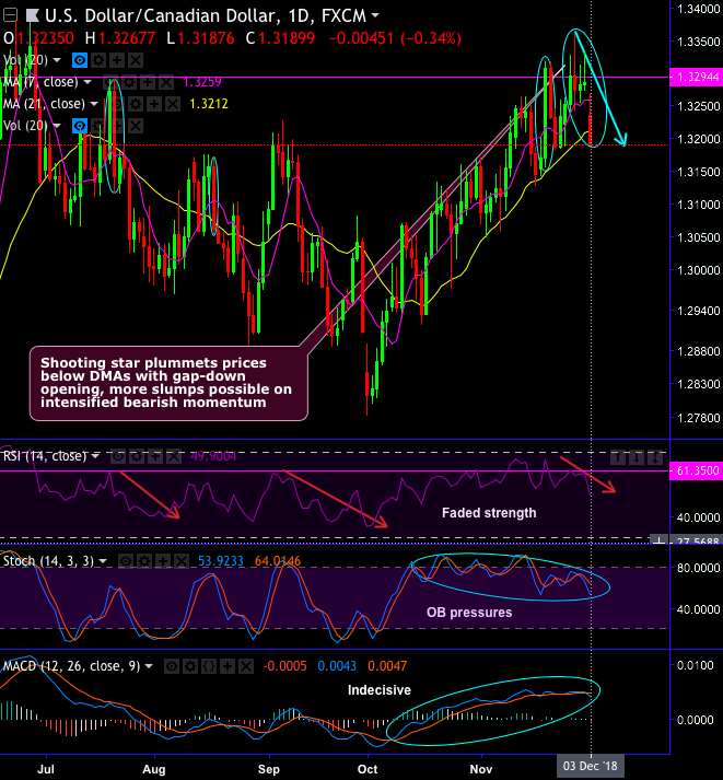- Trade tips: Contemplating prevailing bearish sentiments of this pair, the current spot reference is hovering below 21-DMA levels, it is wise to trade tunnel spread options strategy using strikes of 1.3211 levels and lower strikes at 1.3141 levels to attain exponential yields.