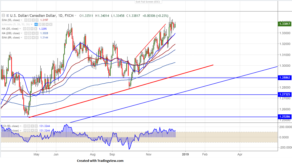 USD/CAD has once again recovered after showing a minor decline yesterday. US jobless claims declined sharply to 206000 compared to forecast of 226000 and US CPI came flat compared to previous month of 0.3% and annualized CPI came at 2.2% from 2.5%. The only factor which was supporting Canadian dollar was slight easing of trade tensions between US and China .The slightly dovish BOC and weak oi prices are putting pressure on C$. The pair hits intraday high of 1.34014 and currently trading around 1.33822.