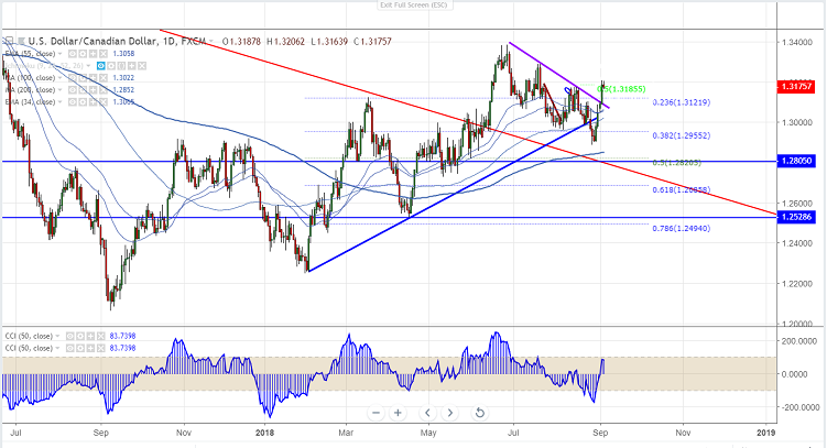 USD/CAD has gained more than 100 pips yesterday from the low of 1.30895 as deadline for the North American Trade Agreement (NAFTA) ended on Friday .Trump’s tweet on previous week on NAFTA also supported Canadian dollar decline. Trump tweeted "If we don’t make a fair deal for the U.S. after decades of abuse, Canada will be out. Congress should not interfere w/ these negotiations, or I will simply terminate NAFTA entirely & we will be far better off..." and then added "....Remember, NAFTA was one of the WORST Trade Deals ever made. The re-negotiation of US and Canada trade deal is happening this week. It hits high of 1.32077 and is currently trading around 1.31819.