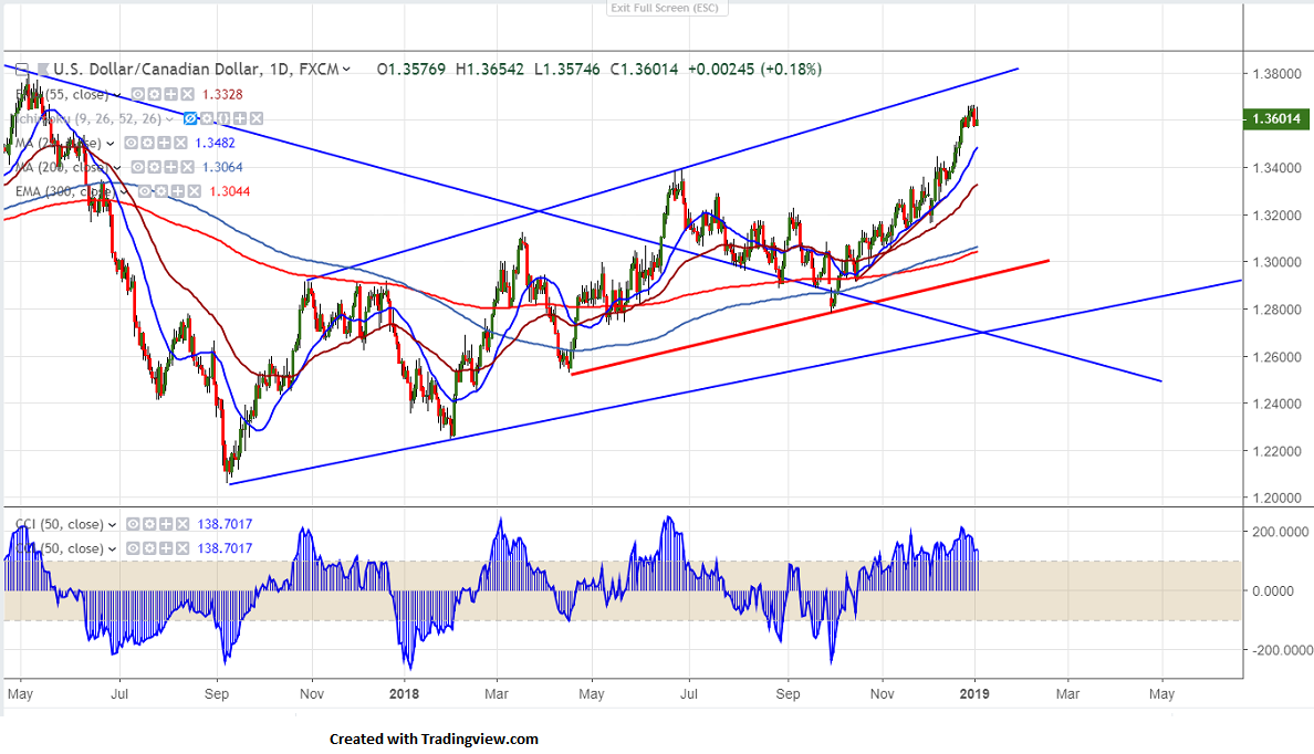 USDCAD was one of the top performer in year 2018. The pair has jumped nearly 8% this year on account of weak oil price and dovish Bank of Canada statement. It hits high of 1.36615 and lost nearly 100 pips on account of slight jump in oil prices .It is currently trading around 1.36082.