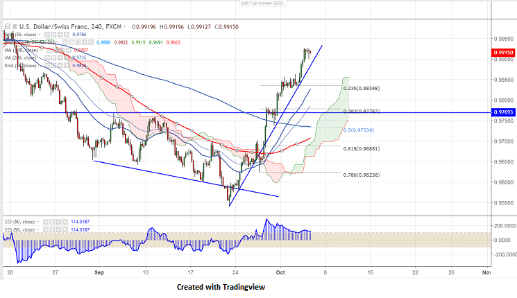 USDCHF has closed well above 100- day MA and confirms bullish continuation. The near term resistance is around 0.99450 and any break above will take the pair to next level till 1.0000/1.0045.