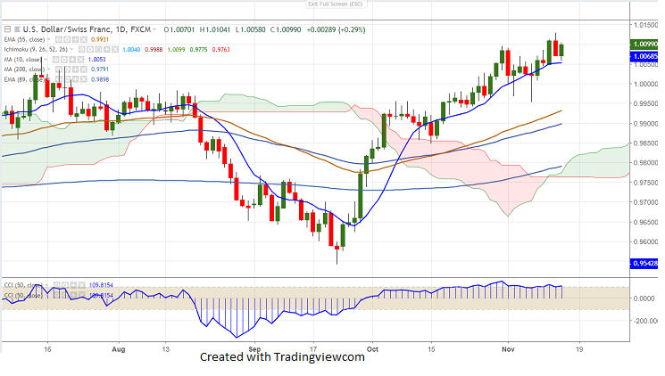 USD/CHF is trading higher after minor correction. The pair declined till 1.00580 more than 70 pips from the high. It hits high of 1.01283 yesterday and is currently trading around 1.00990.The policy divergence and broad-based US dollar buying is supporting USD. Intraday trend is positive as long as support 1.00520 holds. The pair holds above 1.0100 level and this confirms minor bullishness.