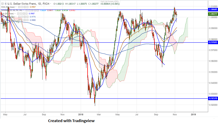 USDCHF has recovered more than 80 pips from ow of 0.99525 made yesterday. The pair formed temporary top around 1.00949 on Oct 31st 2018 and declined almost 140 pips. It hits intraday high of 1.00317 and is trading around 1.00239.