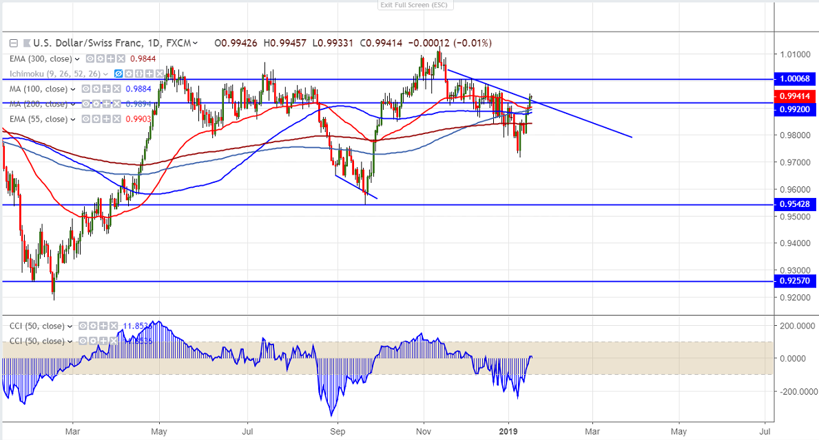 USDCHF is trading higher for 4th consecutive day and jumped more than 150 pips on account of easing geopolitical tensions. The trade optimism between US and China has increased demand for risky assets such stocks. The pair has formed a minor bottom around 0.97165 and recovered nearly 2.45% from the low. The pair hits high of 0.99554 and is currently trading around 0.99422.