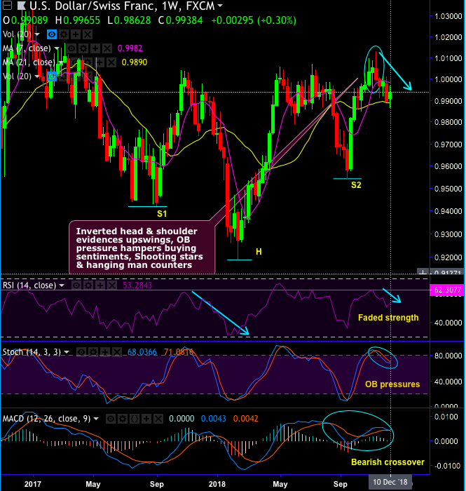 This bullish pattern chart evidences upswings, but overbought pressure shown by momentum oscillators hamper interim buying sentiments, while shooting stars & hanging man patterns pop at 1.0053 and 0.9996 levels that counter previous buying sentiments.
