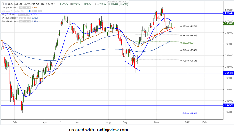 USD/CHF shown a recovery of more than 70 pips from low of of 0.99175 The pair was trading slightly weak yesterday after dovish Fed Chairman statement. Fed Chairman Powell said that interest rates are below “neutral level” and this indicates that Fed will pause the rate hike for a while. The US dollar recovered sharply after yesterday’s fall on account of Trump and Xi meeting in G20 summit. It has formed temporary top around 1.00058 and is currently trading around 0.9980.