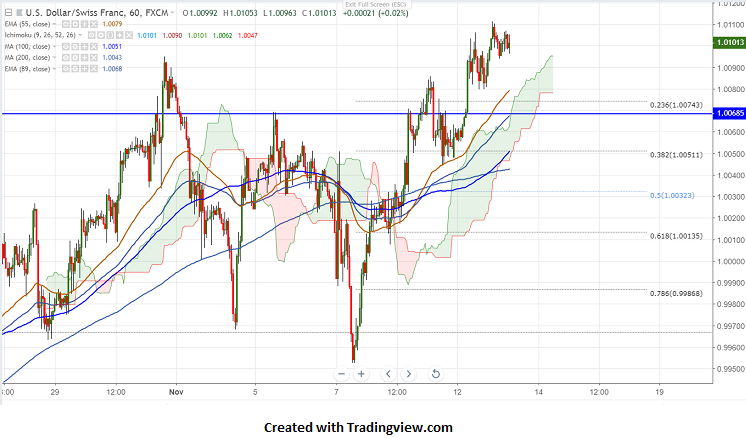 USDCHF is consolidating for the past 10 hours after hitting high of 1.01140 level. The policy divergence and broad-based US dollar buying is supporting USD. Intraday trend is positive as long as support 1.00430 holds. The pair holds above 1.0100 level and this confirms minor bullishness.It is currently trading around 1.01023.
