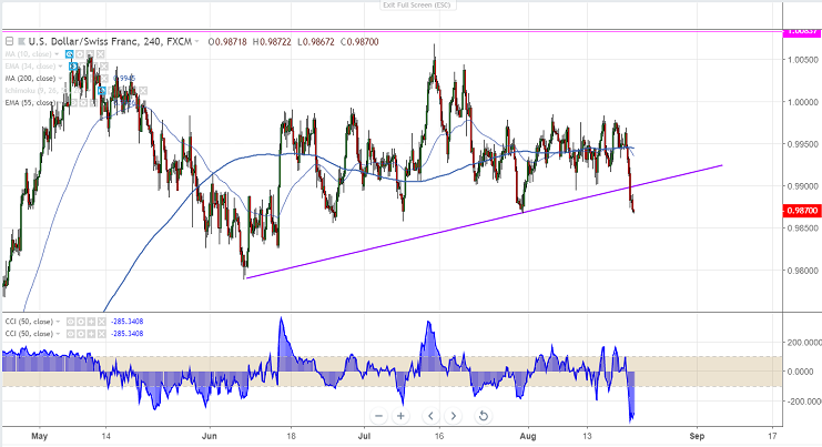 After a long consolidation the pair declined well below 0.9900 level. The pair had hits low of 0.98947 on Aug 9th 2018 and showed a minor recovery till 0.99825. The broad selling in US dollar after Trump’s comment on US fed was the main reason for good dip in this pair. The pair hits low of 0.98686 at the time of writing and is currently trading around 0.98721.