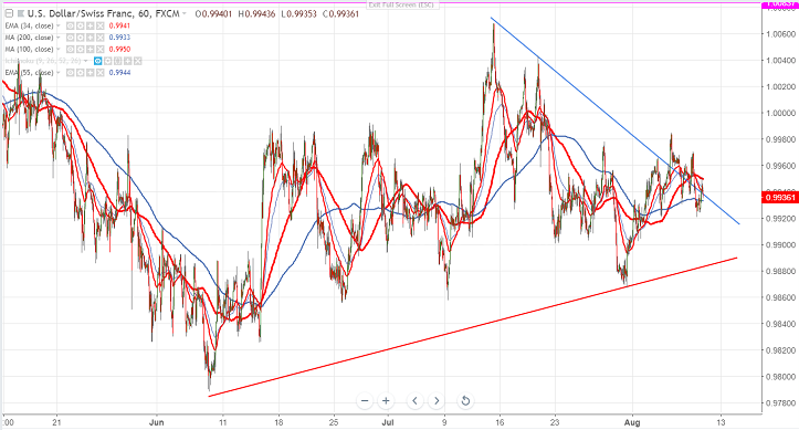 USD/CHF has formed higher low and lower high. The pair hits high of 0.99707 and started to decline from that level. Short term trend is weak as long as resistance 1.000 holds. The escalating trade war between US and China supports Swiss franc. Markets eye US PPI and CPI data for further direction. The policy divergence will prevent the downside of USD/CHF.