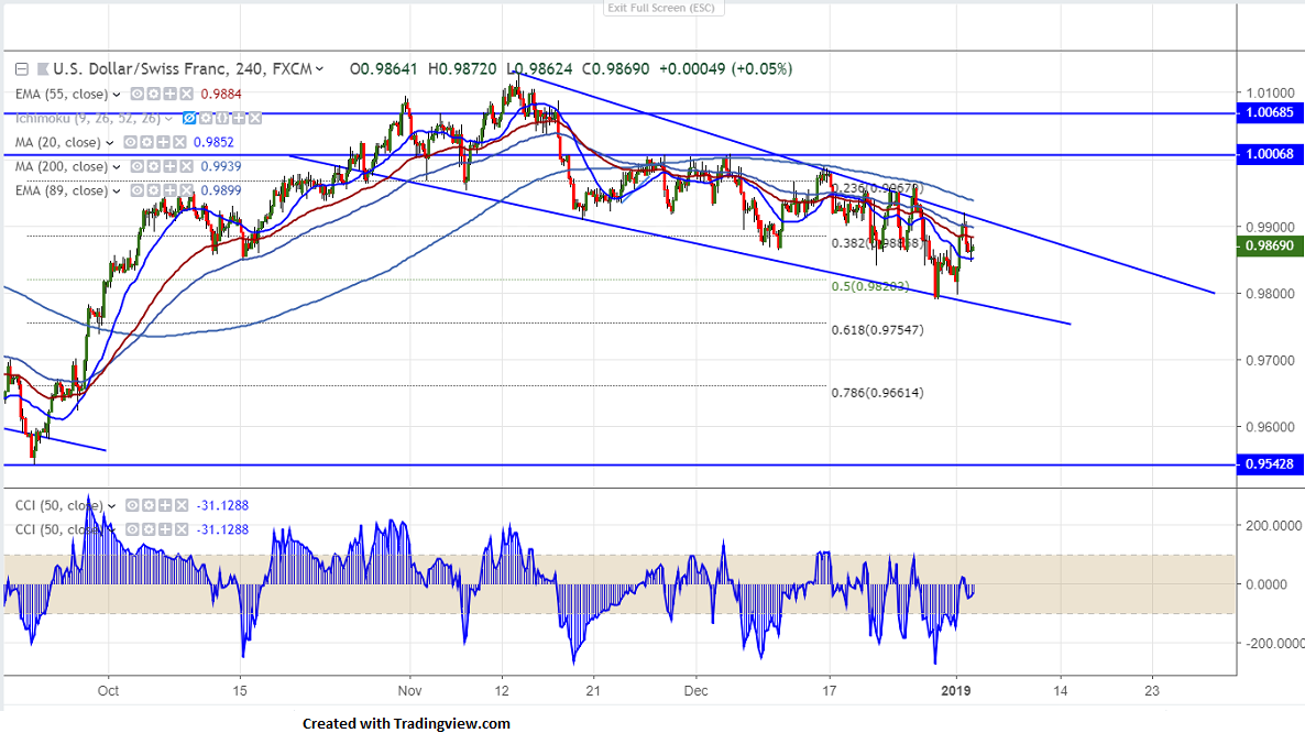 USD/CHF has once shown a good recovery from low of 0.97899. It hits high of 0.99205 and shown a minor dip. The Swiss franc was trading higher for past one week on account of global stock market turmoil which increased demand for safe haven assets like yen ,goldand Swiss Franc . But broad based US dollar buying after New year is putting pressure on Swiss franc. It is currently trading around 0.98703.