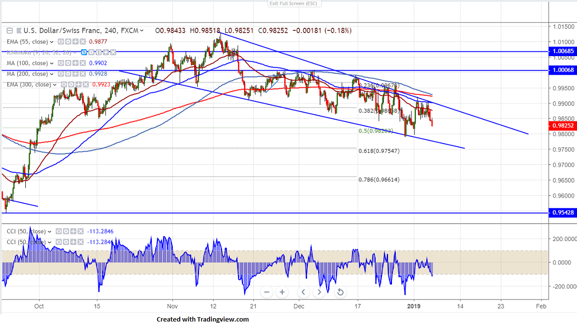 USD/CHF has once shown a declined after showing a minor recovery till 0.99082 and started to decline. It hits intraday low of 0.98298 and is currently trading around 0.98309. The Swiss franc was trading higher for past three trading session on account of global stock market turmoil which increased demand for safe haven assets like yen ,gold and Swiss Franc . But slightly dovish comments from Fed Chairman Powell is putting pressure on US dollar. broad based US dollar buying after New year is putting pressure on Swiss franc. It is currently trading around 0.98703.