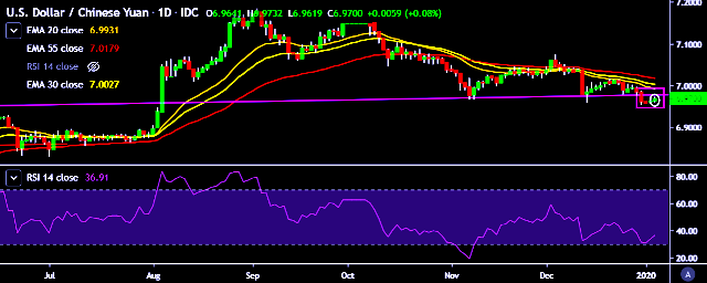 We prefer to take long position on USD/CNY around 6.9650, stop loss at 6.9590 and target of 6.9867/6.9957.