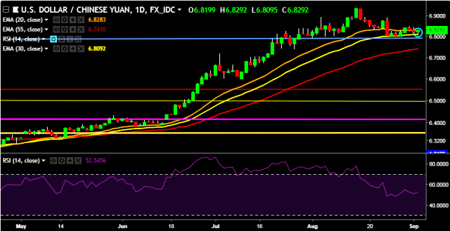 We prefer to take long position on USD/CNY around 6.8200, stop loss at 6.7980 and target of 6.8420/6.8774.