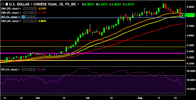We prefer to take short position on USD/CNY only below 6.8020, stop loss at 6.8470 and target of 6.7864.