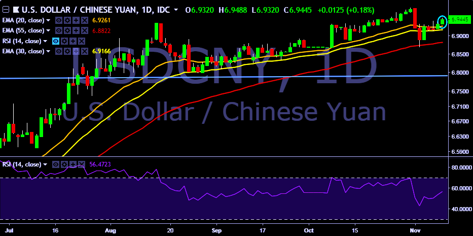 We prefer to take long position on USD/CNY around 6.9400, stop loss at 6.9210 and target of 6.9768.