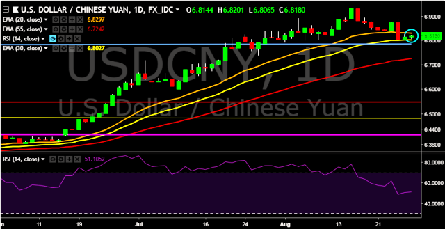 We prefer to take long position on USD/CNY only above 6.8250, stop loss at 6.8037 and target of 6.8470.