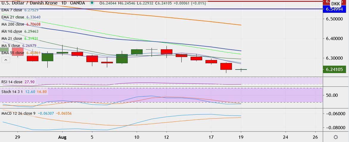 - USD/DKK is trading flat at 6.2449, having hit low of 6.2228 on Tuesday, its lowest since May 2018.