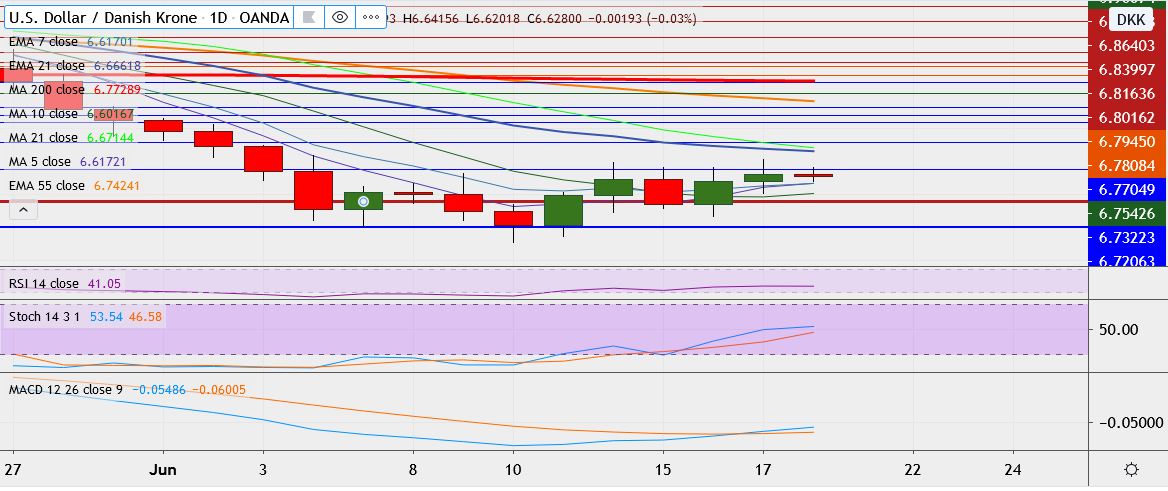 - USD/DKK is trading 0.05 percent down at 6.6266, having hit high of 6.6532 on Wednesday, its highest since June 4.