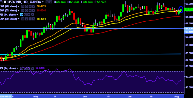 We prefer to take long position on USD/INR around 68.50, stop loss at 68.32 and target of 69.05.