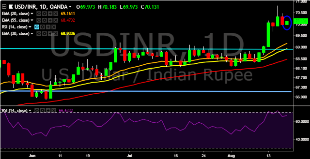 We prefer to take short position on USD/INR only below 69.90, stop loss at 70.38 and target of 69.52.