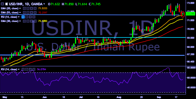 We prefer to take long position on USD/INR around 71.50, stop loss at 71.33 and target of 72.10.