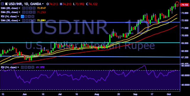 We prefer to take long position on USD/INR only above 74.21, stop loss at 73.80 and target of 74.57/74.88.
