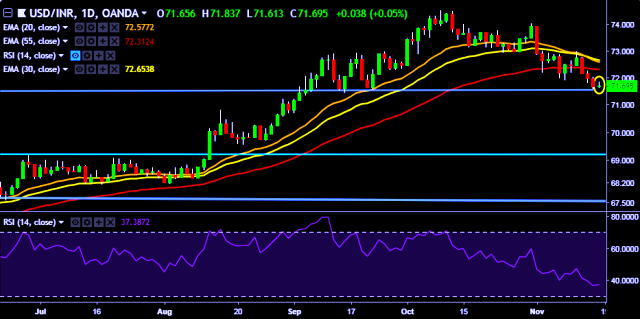 - USD/INR is currently trading around 71.71 marks.