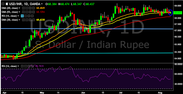 We prefer to take short position on USD/INR only below 68.34, stop loss at 68.70 and target of 68.15.