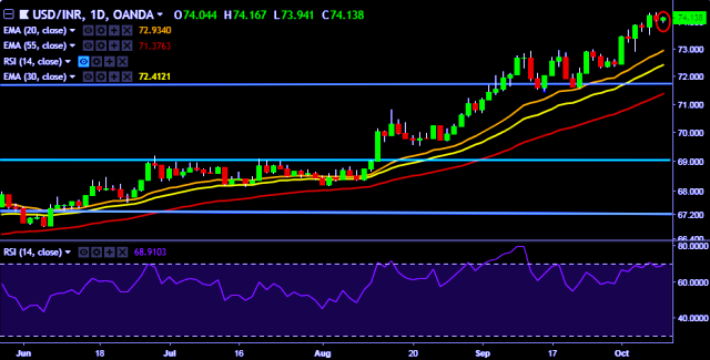 - It made intraday high at 74.16 and low at 73.94 marks.