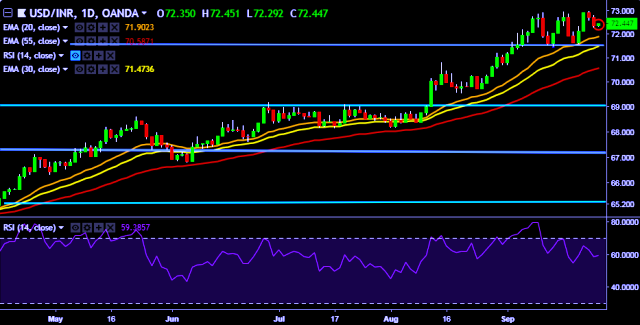 - Key resistances are seen at 72.70, 73.02, 73.24, 73.48 and 73.66 marks respectively.