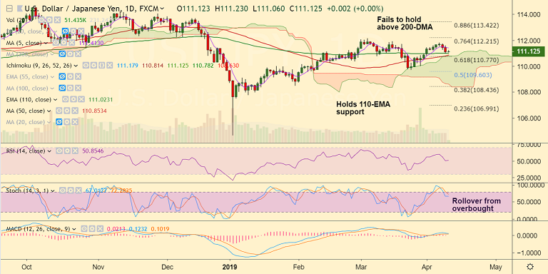 Support levels - 111.02 (110-EMA), 110.85 (50-DMA), 110.77 (61.8% Fib)