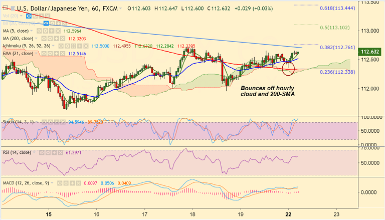 - Price action has bounced off hourly 200-SMA and cloud, we see scope for test of 38.2% Fib at 112.76.