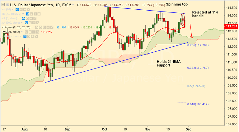 - USD/JPY slips below 5-DMA support after the pair was rejected at 114 handle on Wednesday's trade.